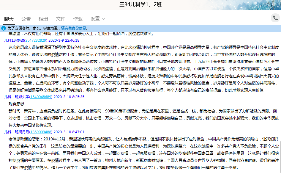 “今天,我收看了全国老员工同上一堂疫情防控思政大课令我受益匪浅,刻骨铭心。在举国上下万众一心,众志成城做好疫情防护工作的特殊时刻,我们也许不能亲临主战场,不能去往第一线,但我们能坚持在大战中坚定信念,不负韶华,我们相信我们会赢。因为在疫情当中,中国展现出的非凡制度和力量给我们极大的信心,中国积极组织人力物力开展大规模的建设,为疫情的防护和救治提供了极大的保障,学校停课不停学,数百万的员工通过直播软件上课;医护人员始终冲在第一线,为疫情防护工作做出了极大的贡献。经过了这一堂思政大课,我明白了许多。明白了少年强则国强,少年独立则国家独立,而最重要的是,我明白了爱国的真正含义。”